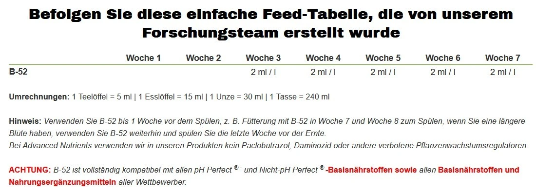 B-52 è pienamente compatibile con Advanced Nutrients Sensi Grow e Bloom/Connoisseur e non interferisce con la loro tecnologia “pH perfect”.