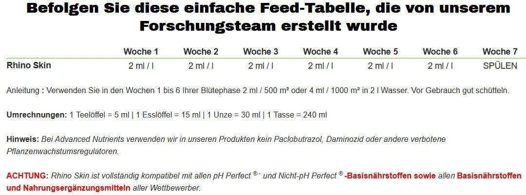 - Rhino Skin è pienamente compatibile con tutti i nutrienti di base pH Perfect ® e non pH Perfect ®, nonché con tutti i nutrienti di base e gli integratori della concorrenza.