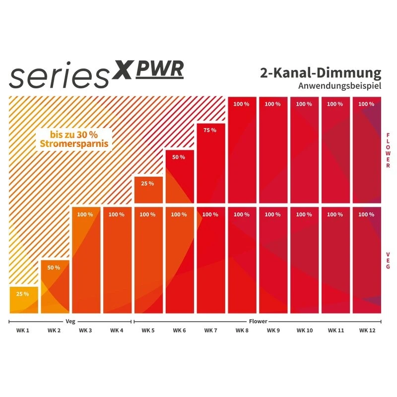 Con la nuova seriex di LED per impianti, è finalmente possibile regolare individualmente due diversi spettri di luce. Con l’aiuto dei 2 canali (spettro di crescita e fiore), è possibile regolare la luce della pianta individualmente alle esigenze attuali delle vostre piante e risparmiare un sacco di elettricità allo stesso tempo: Mentre i LED delle piante convenzionali sono inevitabilmente appesi più in alto, i nuovi modelli della serieX si possono semplicemente abbassare. Questo fa risparmiare circa il 30% dei costi dell’elettricità !