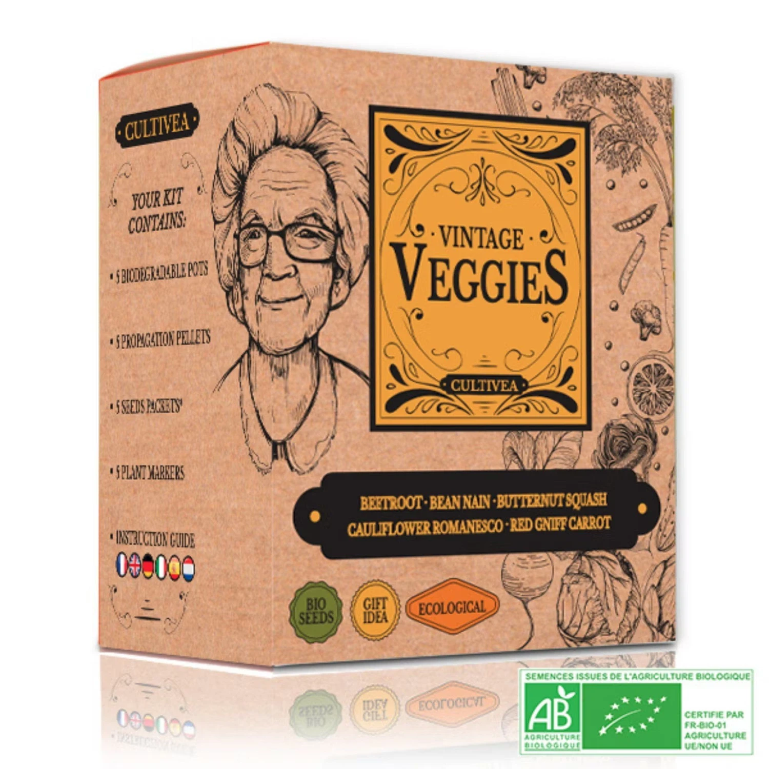 - Cinque varietà di semi di ortaggi biologici antichi: cavolfiore romanesco, fagioli, zucca butternut, barbabietola rossa, carota rossa.