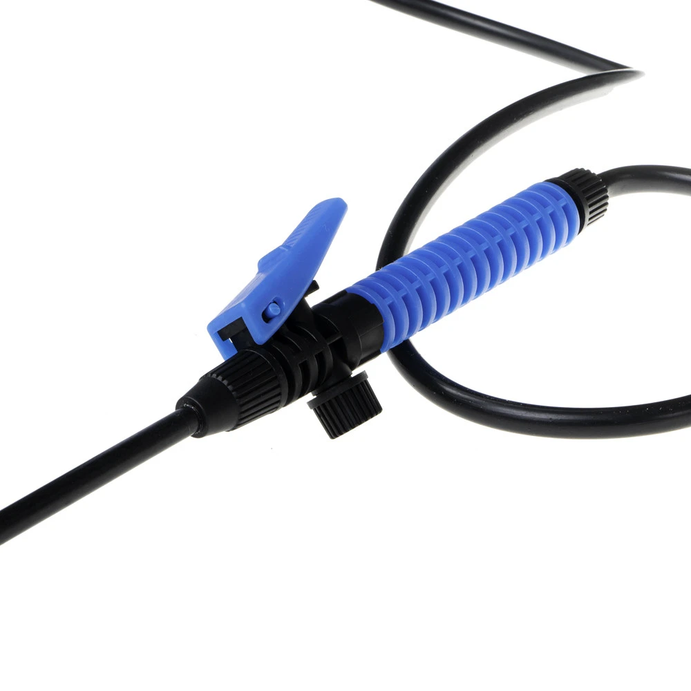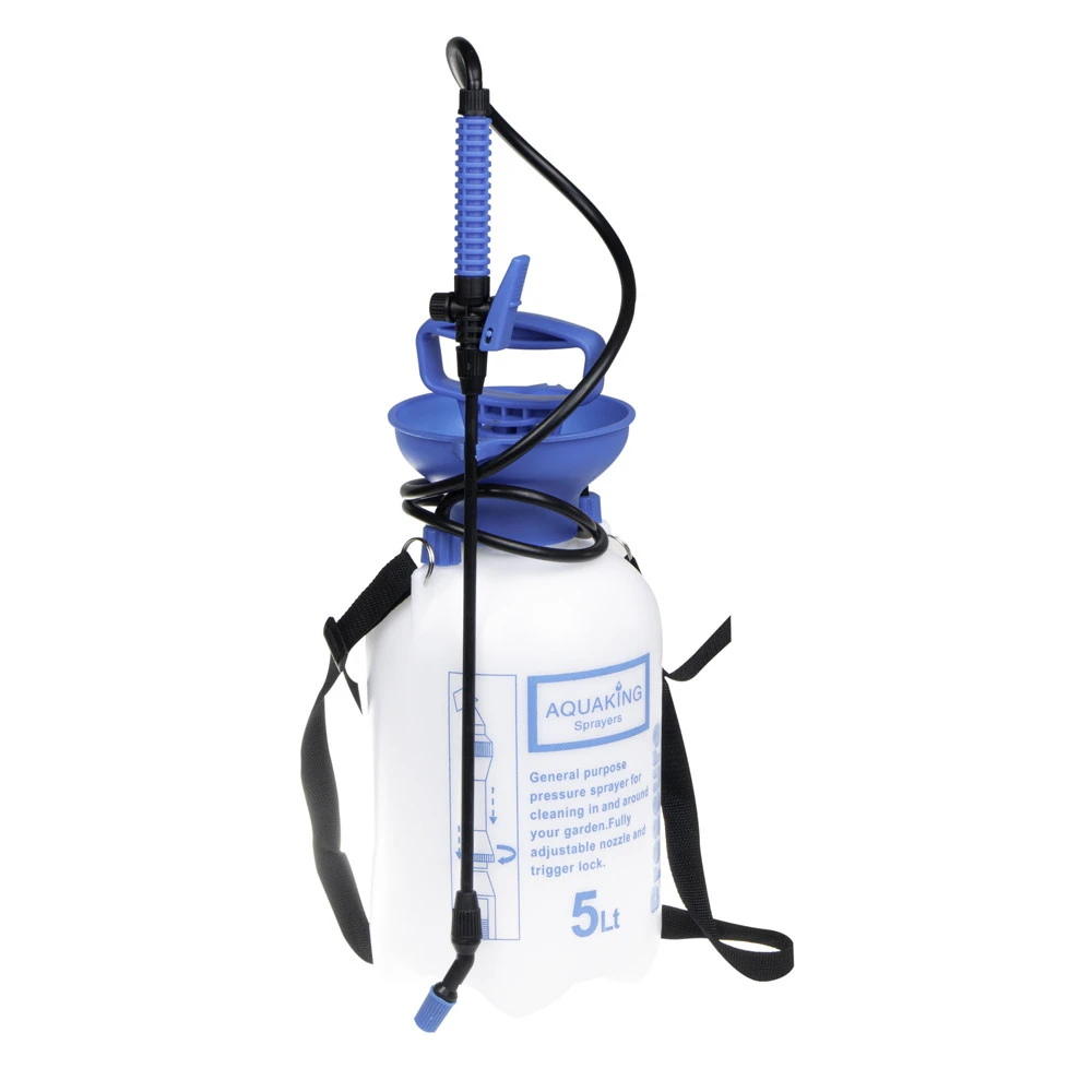 Pompa a pressione dotata di un ugello regolabile in ottone e una valvola di sovrappressione. Capacità di 5 litri.
