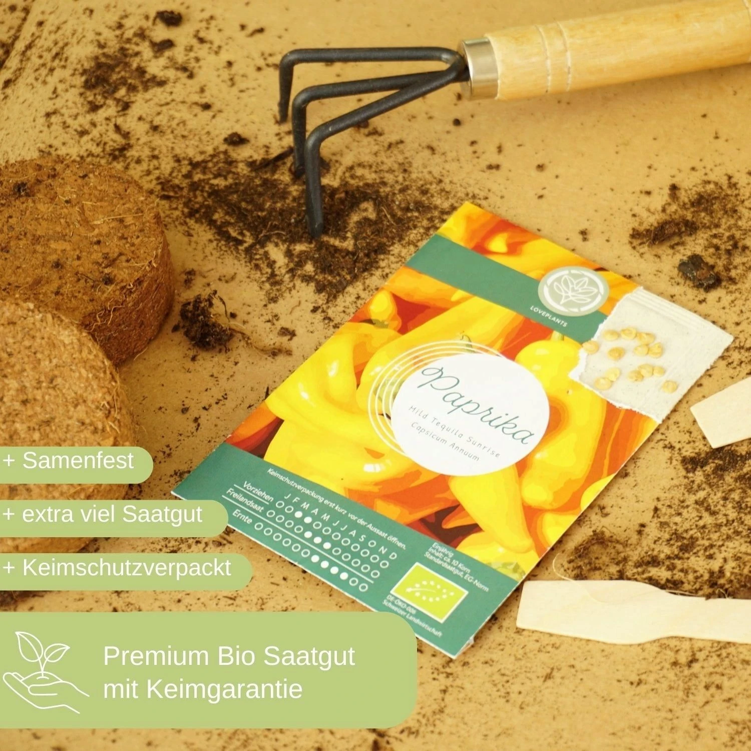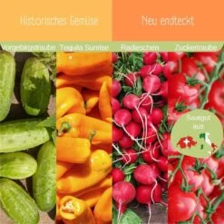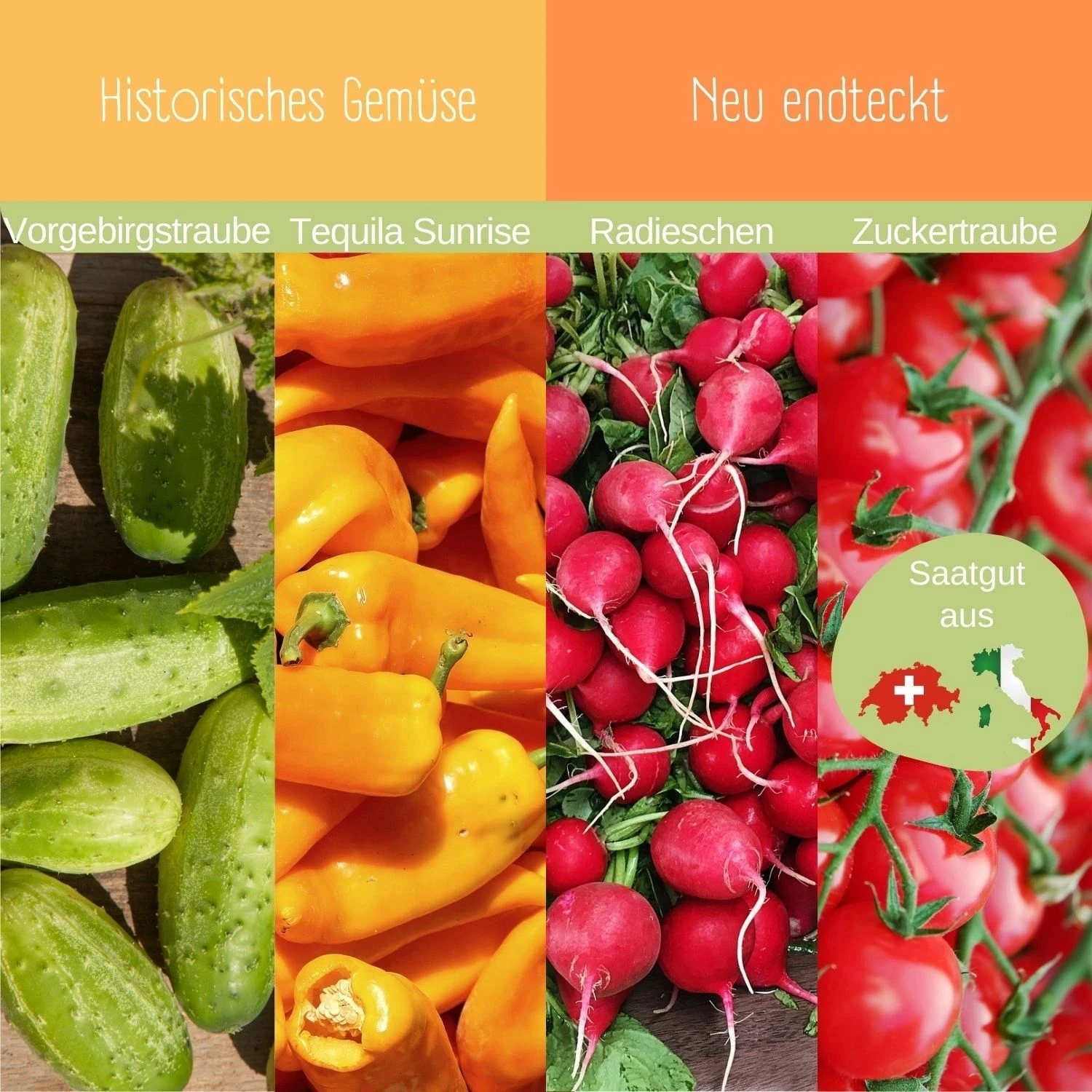 - 4 semi biologici (ravanello Sora, peperone Mild Tequila Sunrise, pomodoro Zuckertraube, cetriolo Vorgebirgstraube).