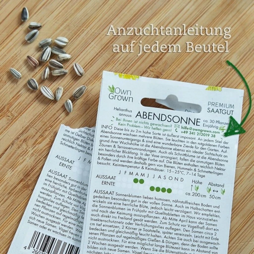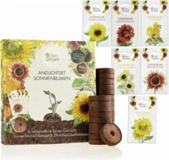Questo set di coltivazione contiene sei diversi tipi di girasoli e le relative compresse a base di cocco. La fioritura dura dei fiori dura fino all’autunno.