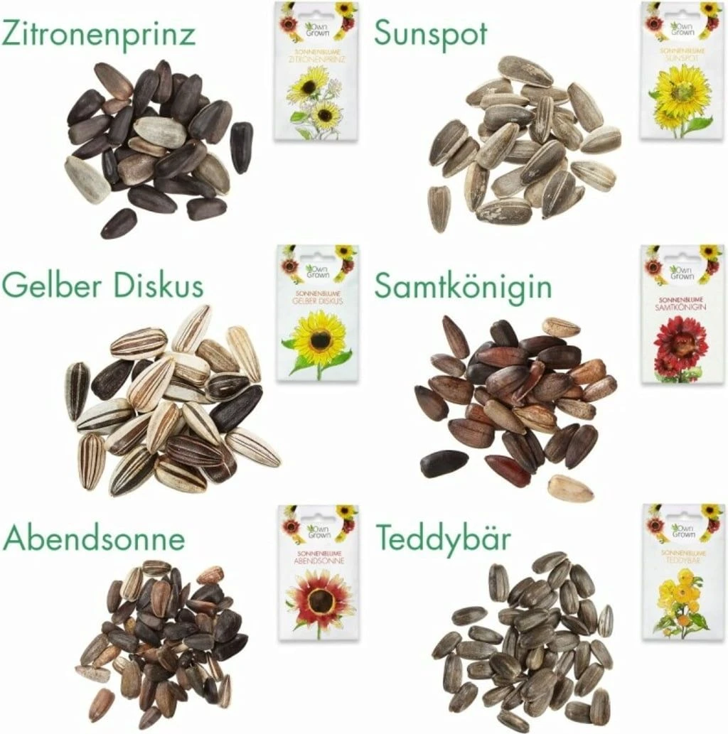 - 6 varietà di girasoli (Abendsonne, Gelber Diskus, Samtkönigin, Sunspot, Teddybär, Zitronenprinz).