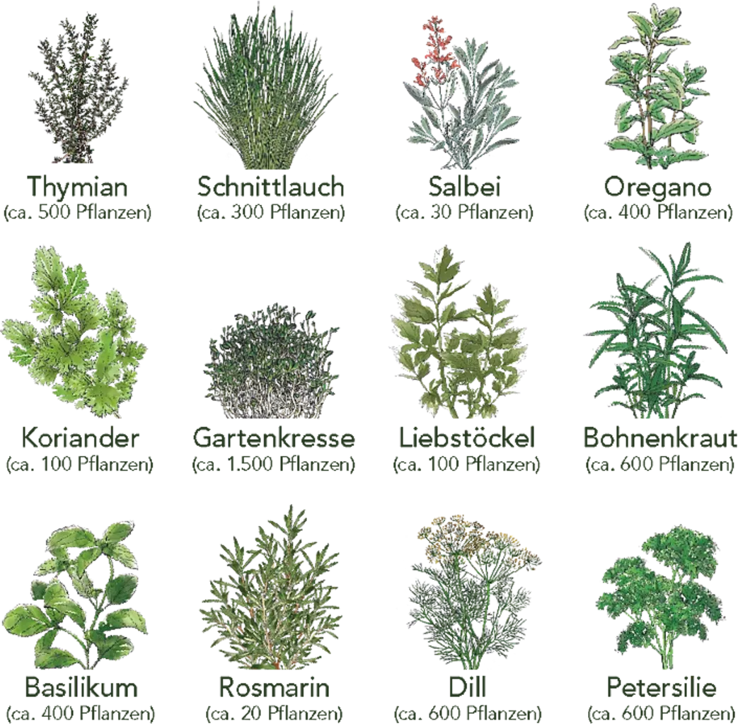 Con: basilico, erba cipollina, aneto, coriandolo, crescione, prezzemolo, timo, salvia, rosmarino, origano, santoreggia, levistico