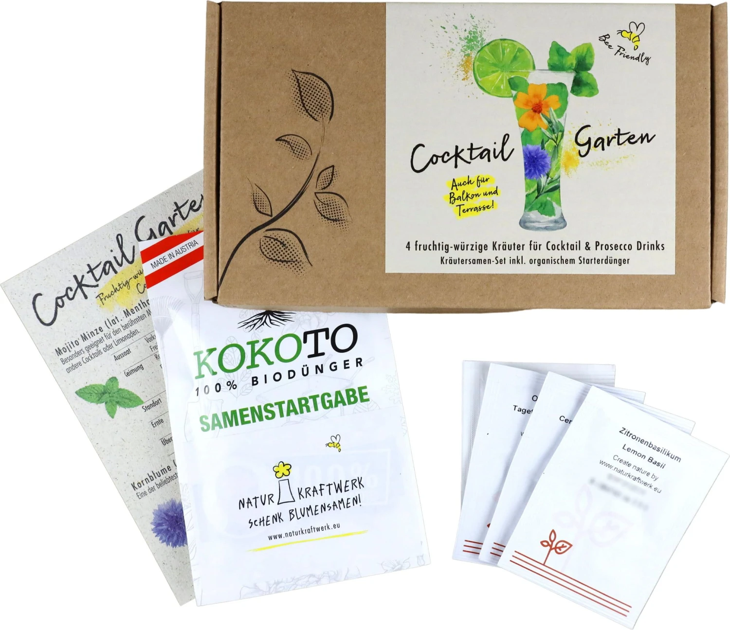 La confezione contiene i semi di 4 diverse erbe aromatiche, 10 g di fertilizzante biologico di Kokoto e una cartolina da colorare (stampata su cartoncino riciclato al 100%).