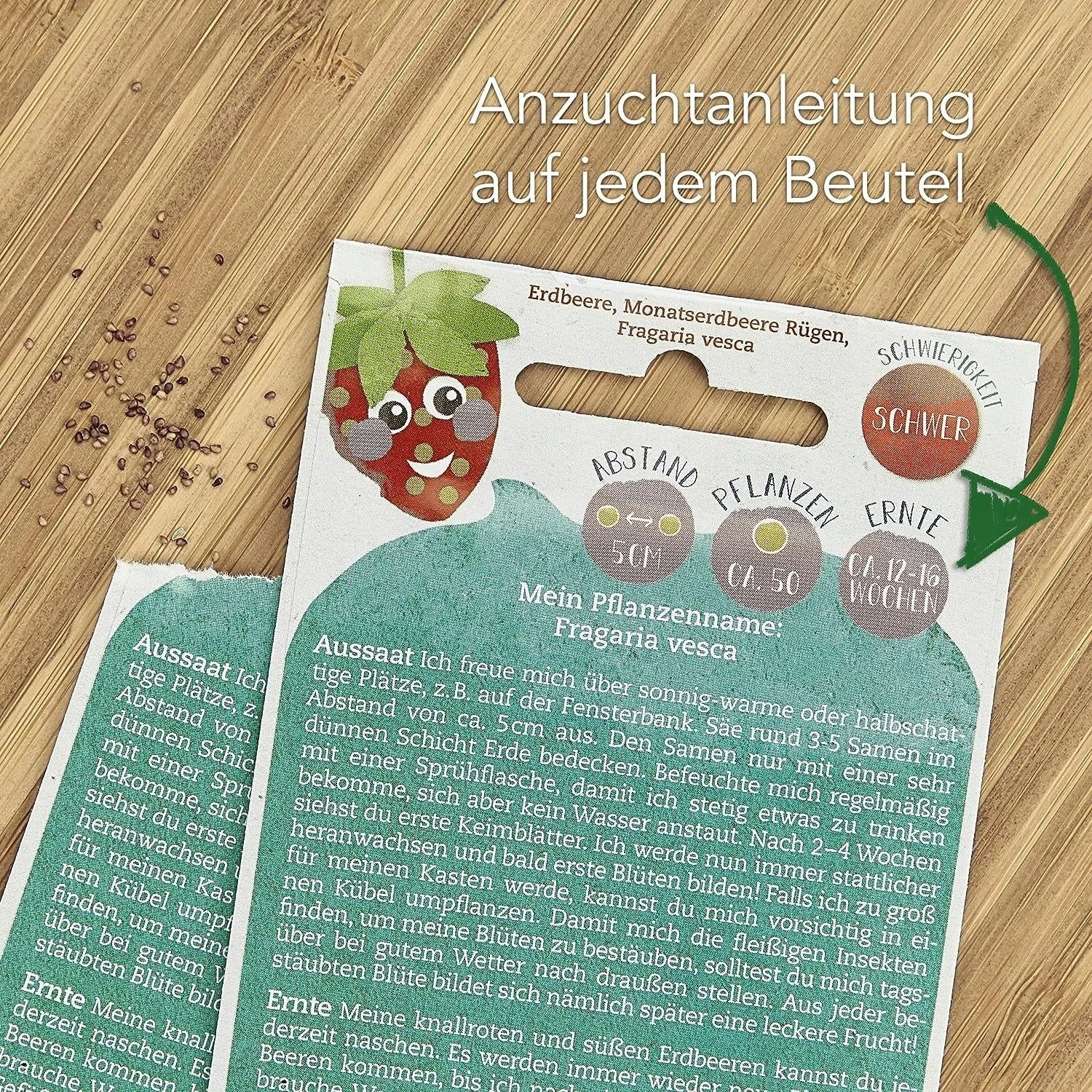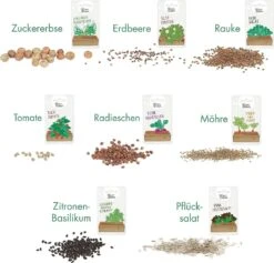 - 8 tipi di semi (ravanelli viola, mini carote, basilico limone, fragole, pomodori, rucola, piselli mangiatutto, lattuga).